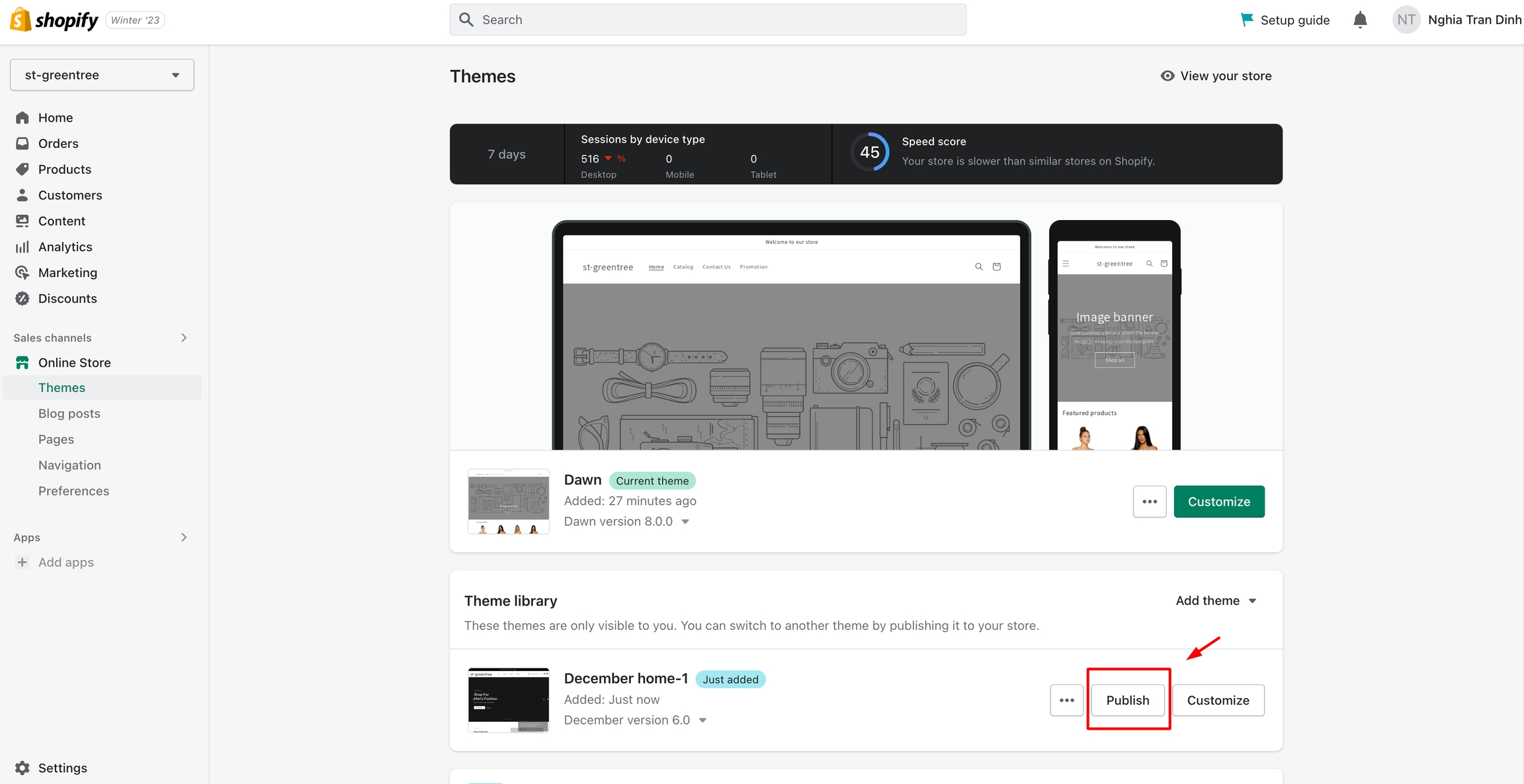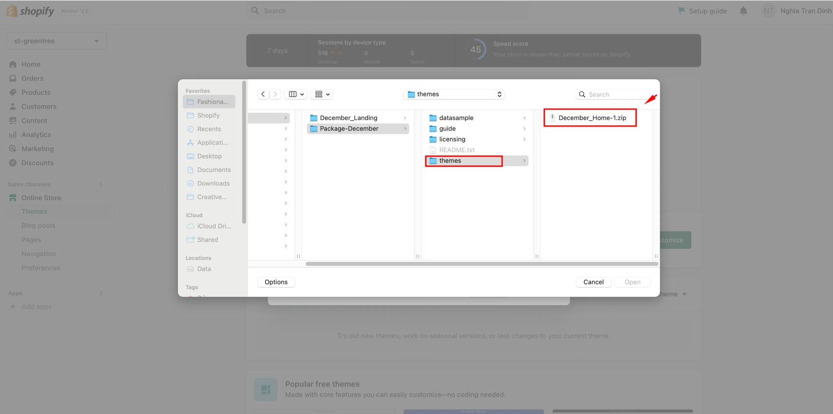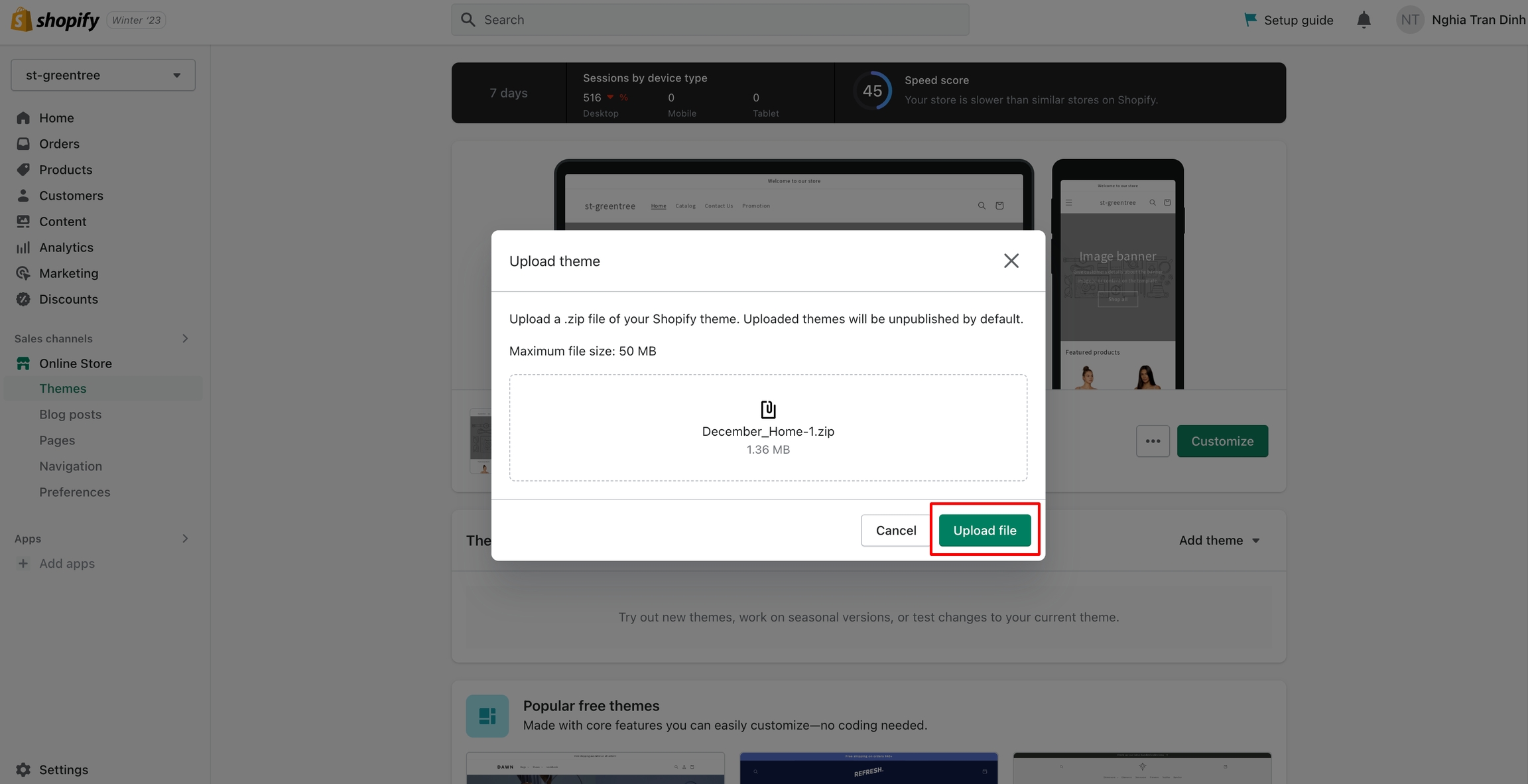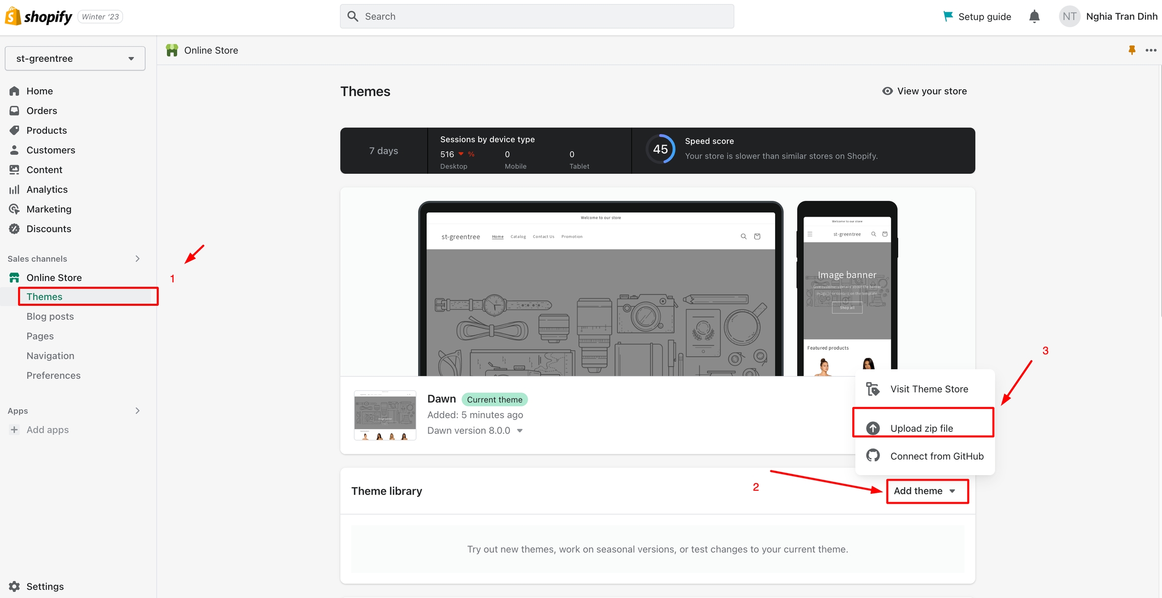 Click on to Add theme dropdown button then select Upload zip file in the Theme library section