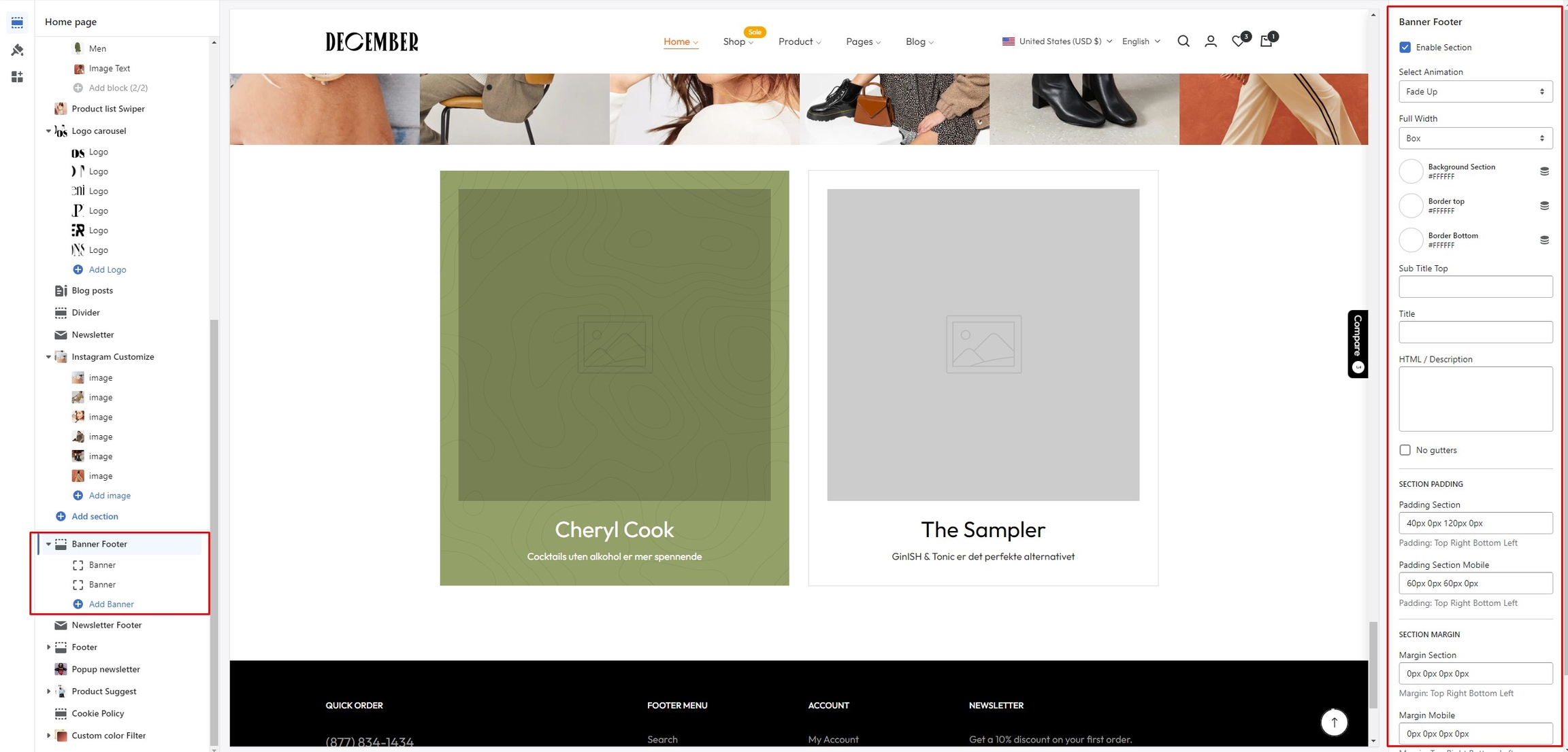 In the theme editor (Customize) => Section, click Banner Footer