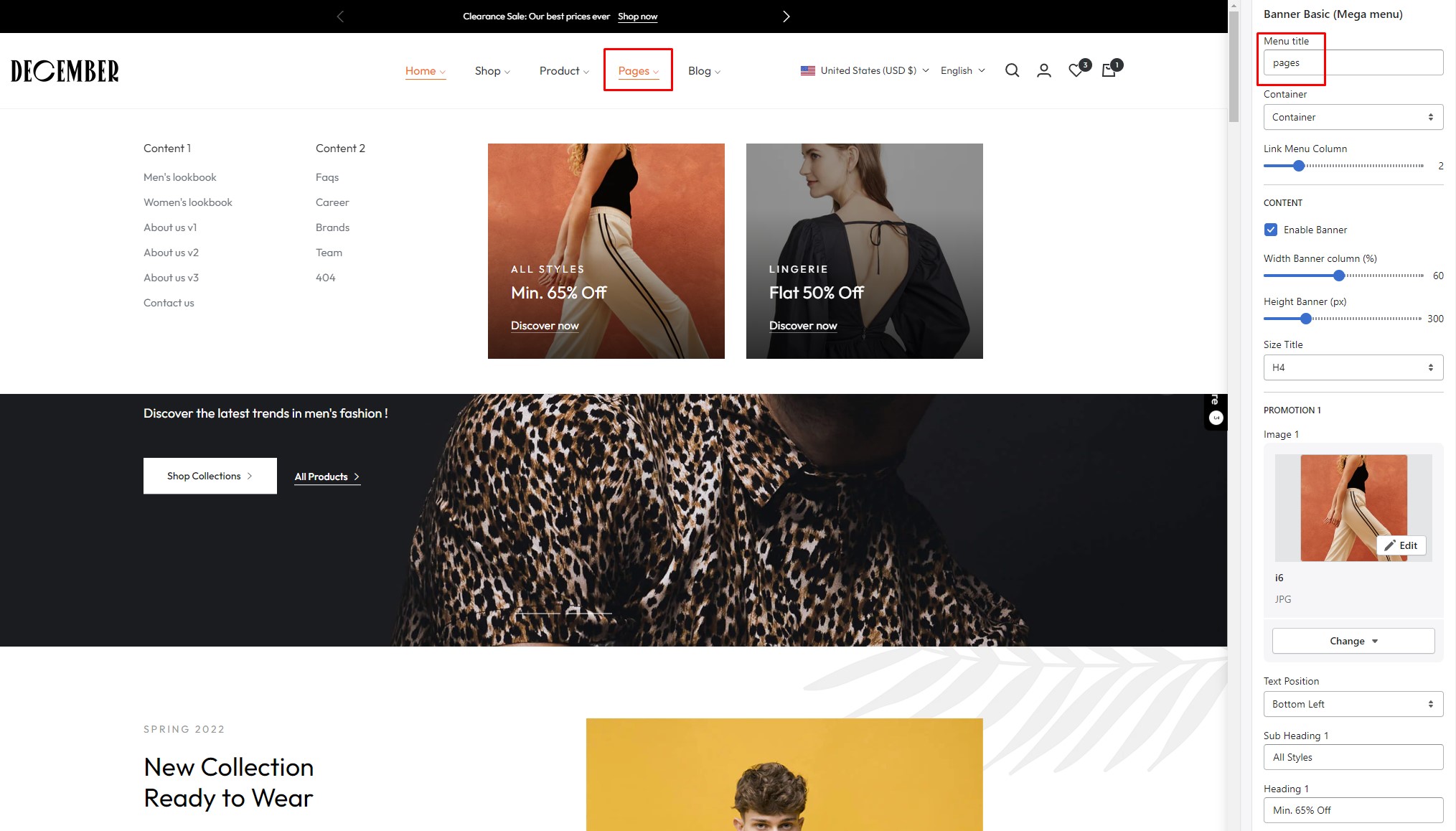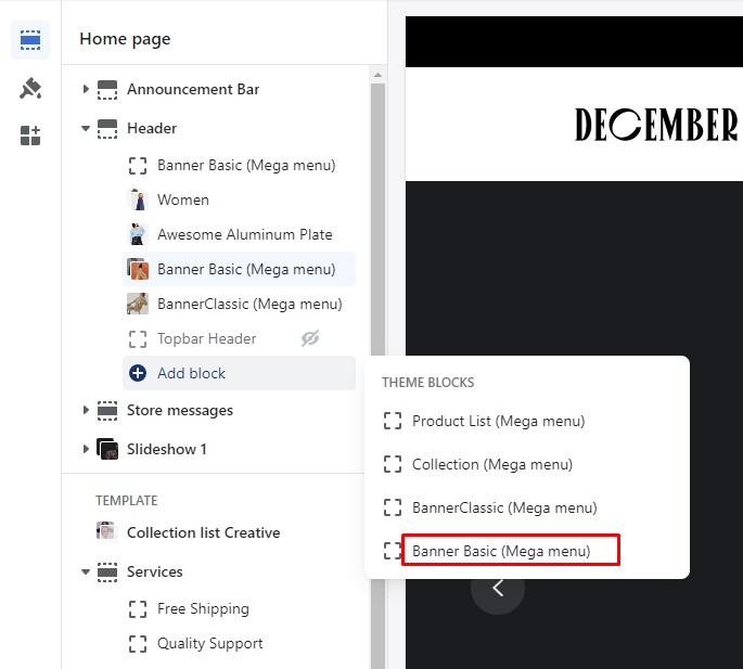 in Customize > click Header > Add Block Banner Basic (Mega menu)